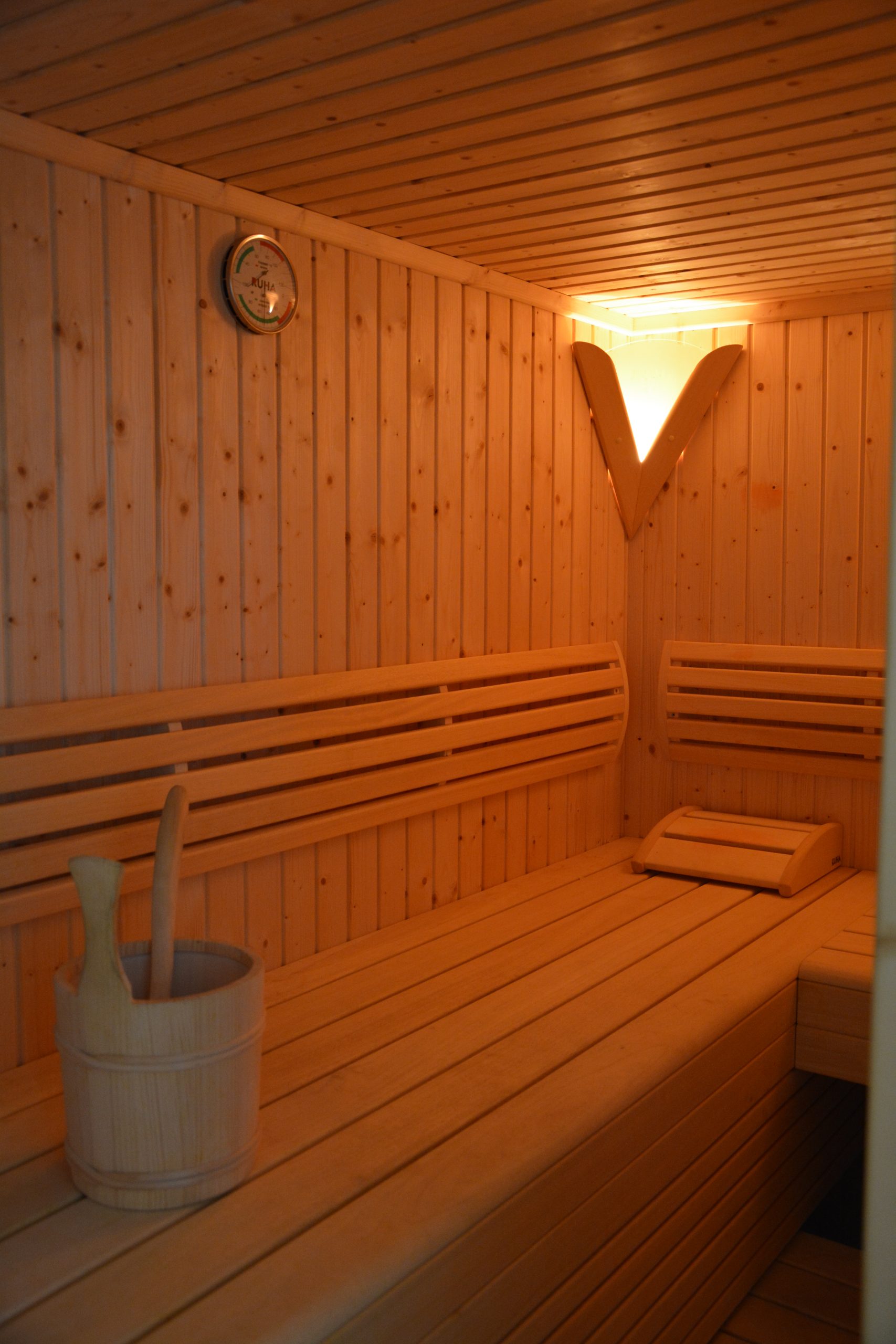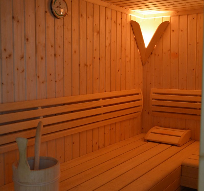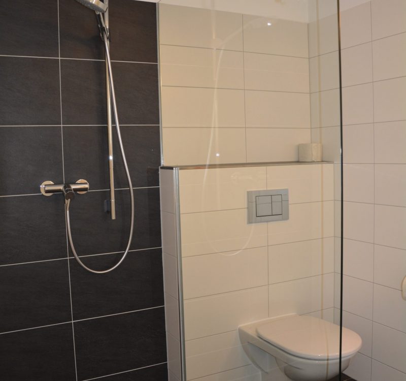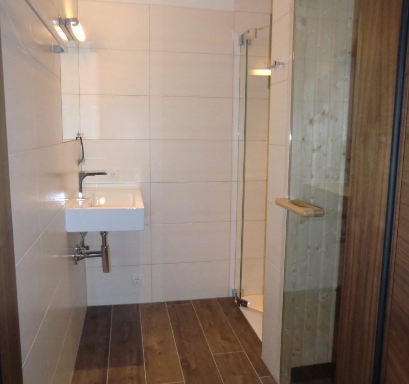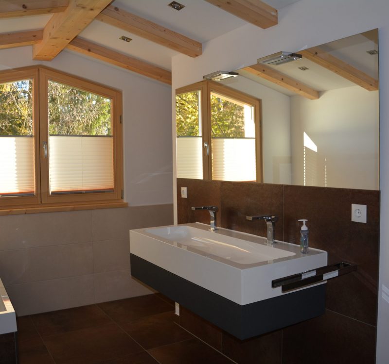 Im Obergeschoss befindet sich ein Badezimmer mit Dusche, Badewanne und WC sowie ein Doppelwaschtisch. Im Erdgeschoss ist ein weiteres Badezimmer mit einer Dusche mit Regenbrause und einem Waschtisch. Dort ist die Sauna integriert. Ein separates WC liegt direkt daneben.