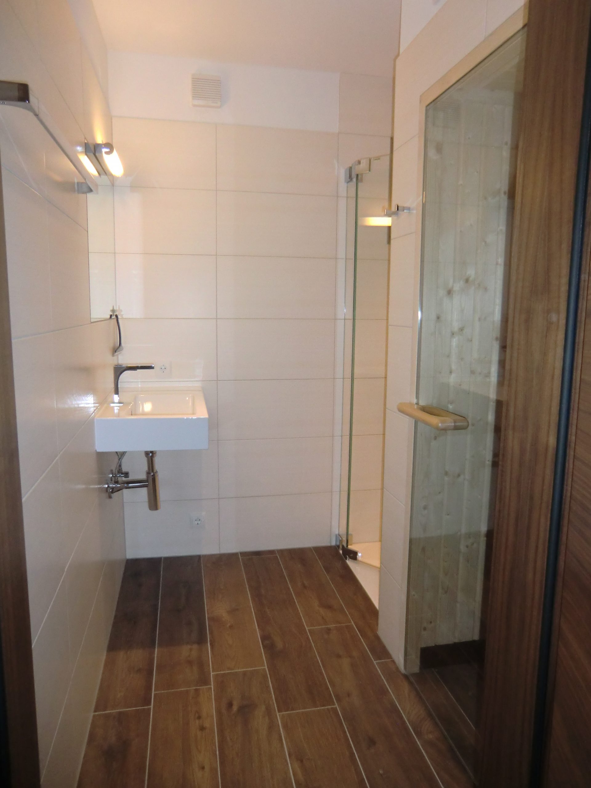 - Ein Badezimmer mit Waschtisch, bodengleicher Dusche mit Regenbrause und Sauna