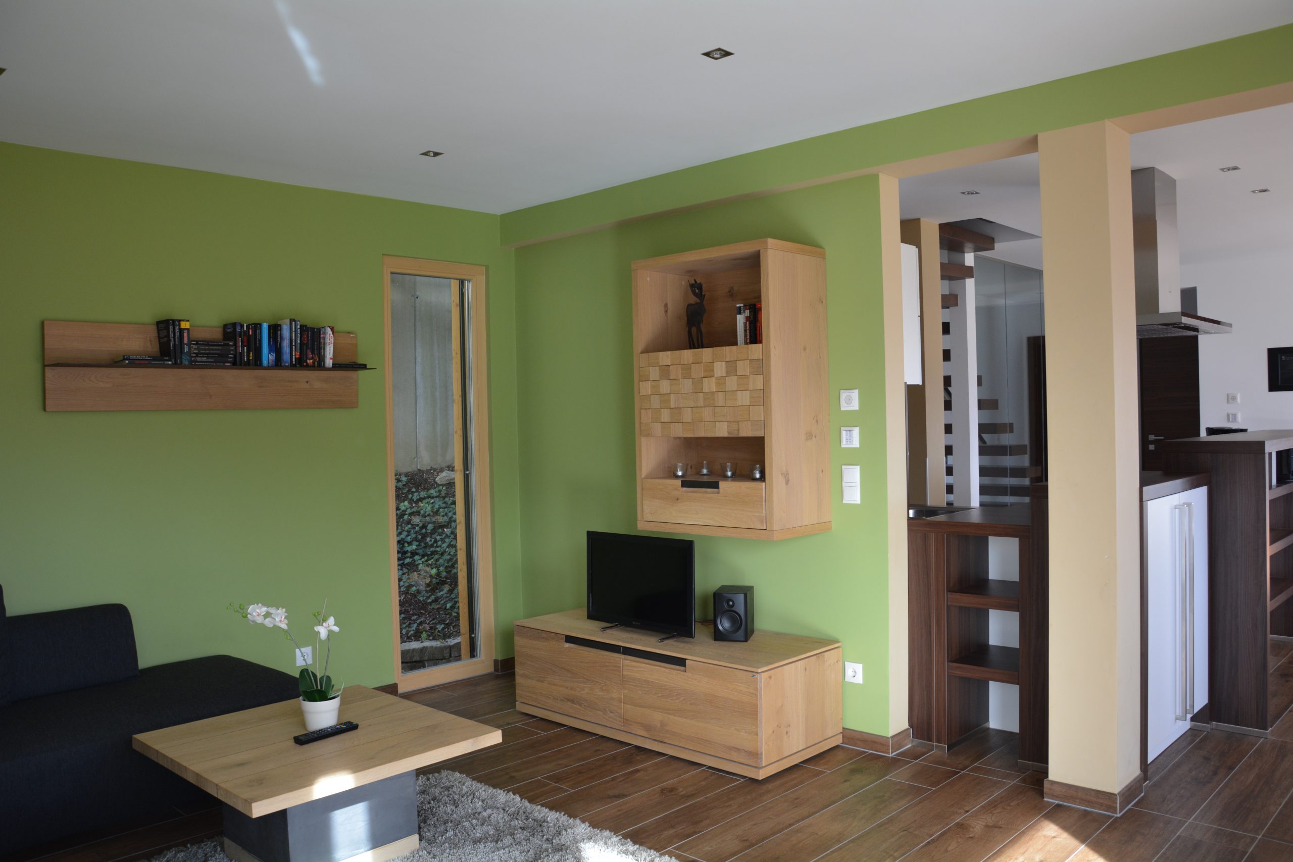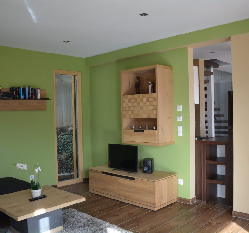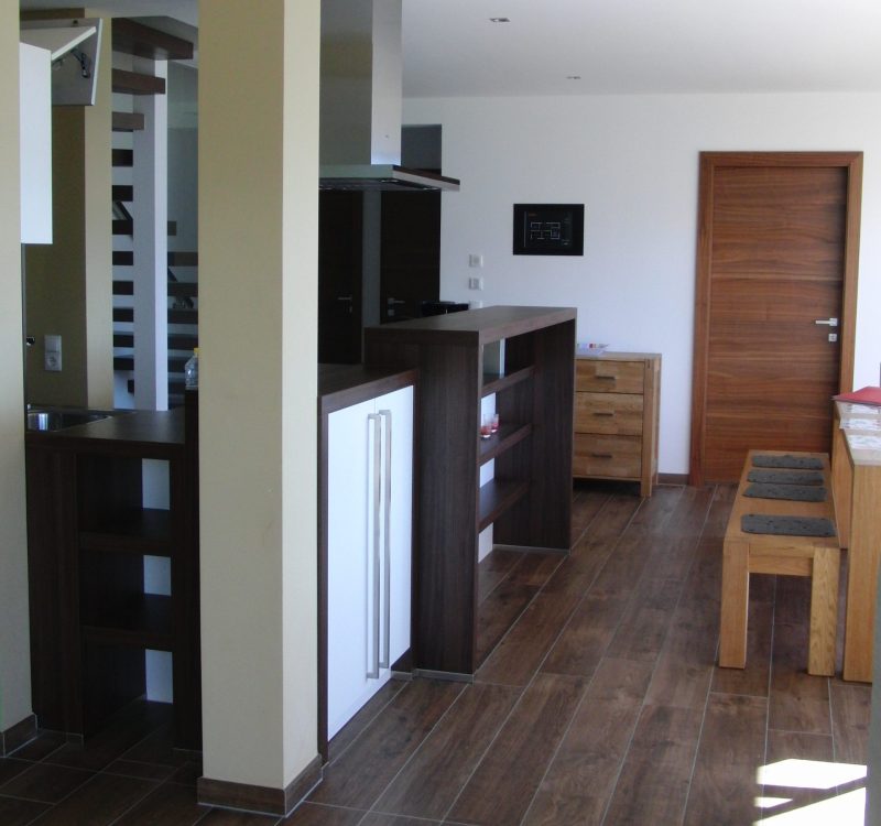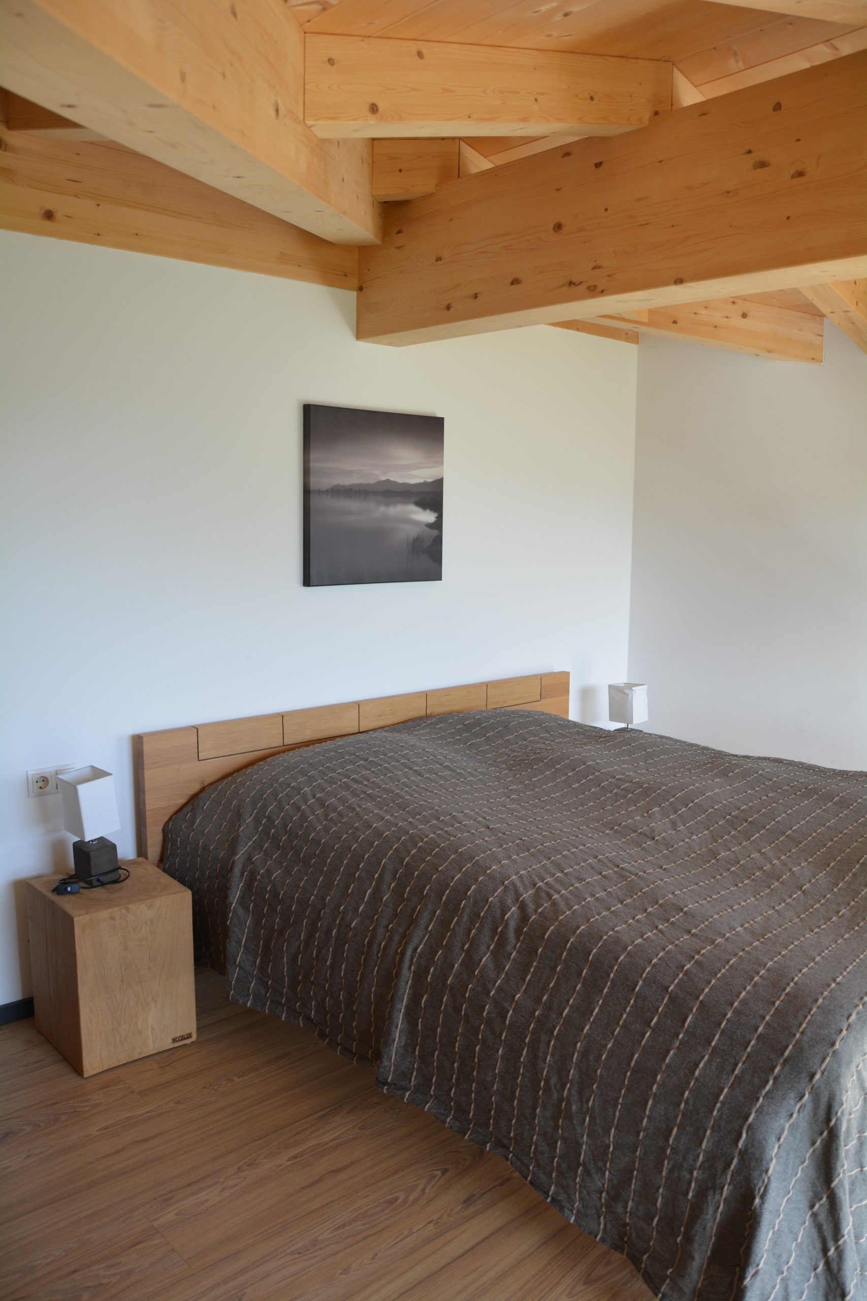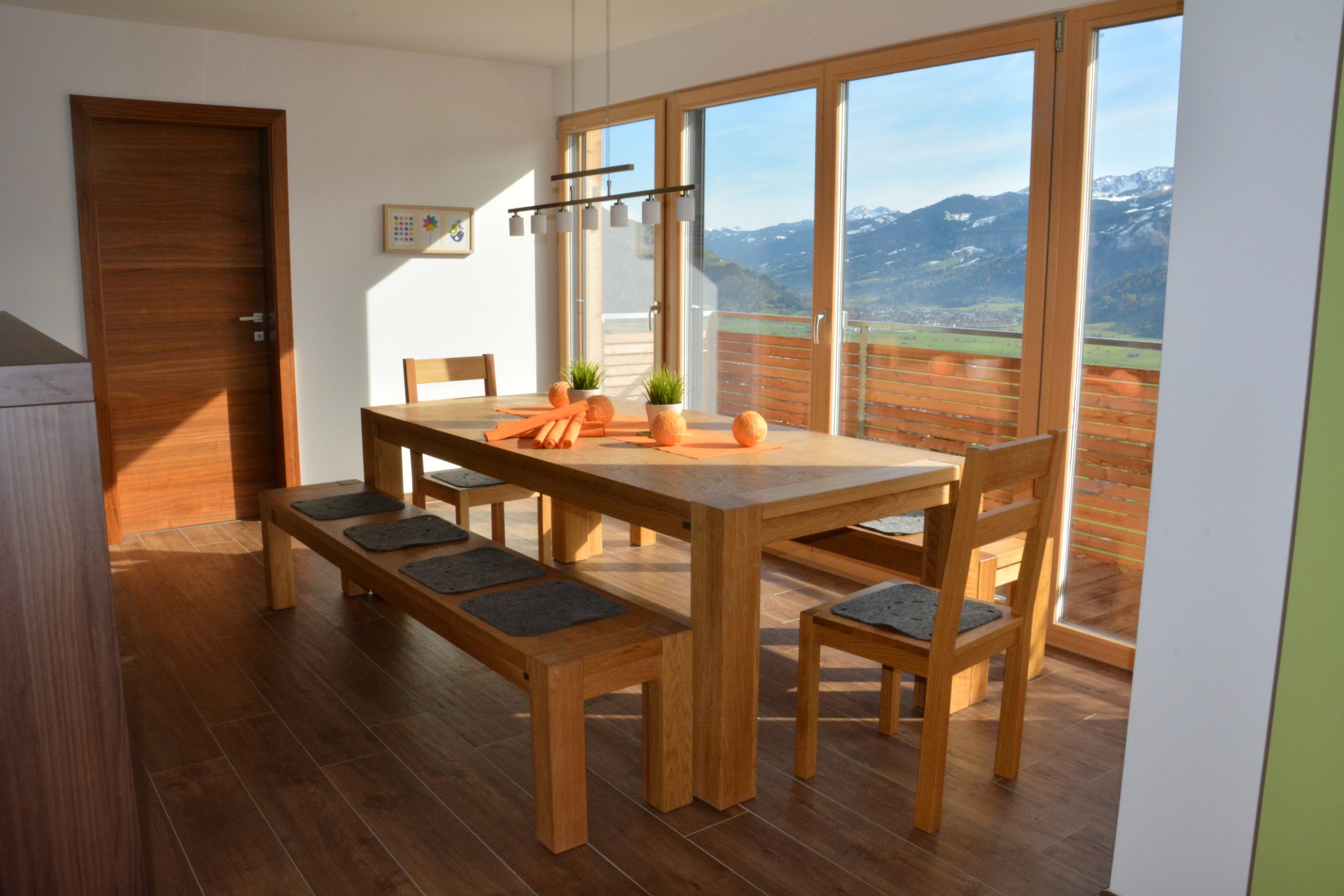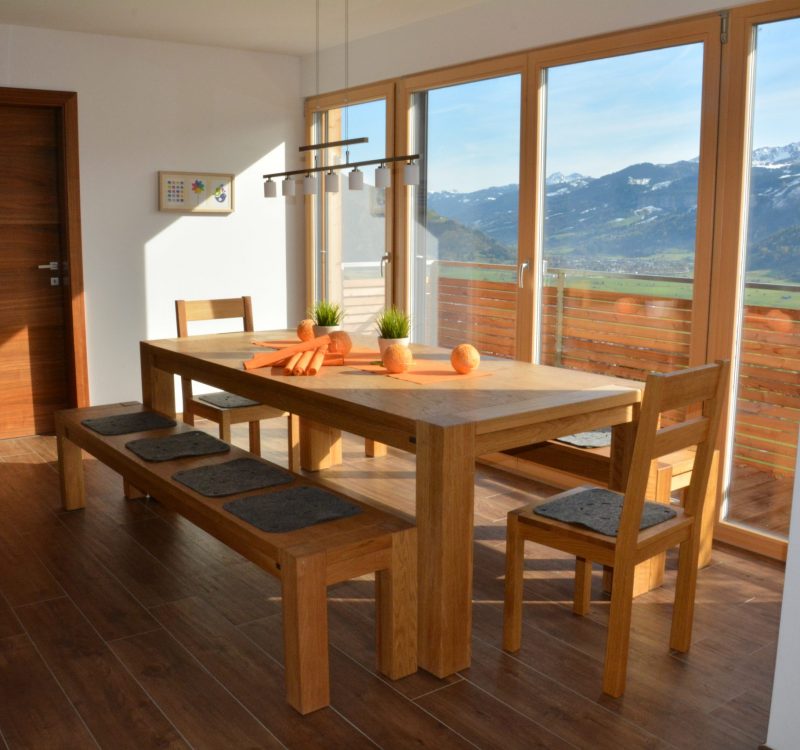 Im Erdgeschoss ist der große offene Wohnbereich mit einer voll ausgestatteten Küche und einem großen massiven Eichentisch, der auch größeren Gruppen ausreichen Platz bietet. Dieser Bereich ist mit großen Fensterfronten ausgestattet, damit man von allen Seiten das fantastische Panorama genießen kann.