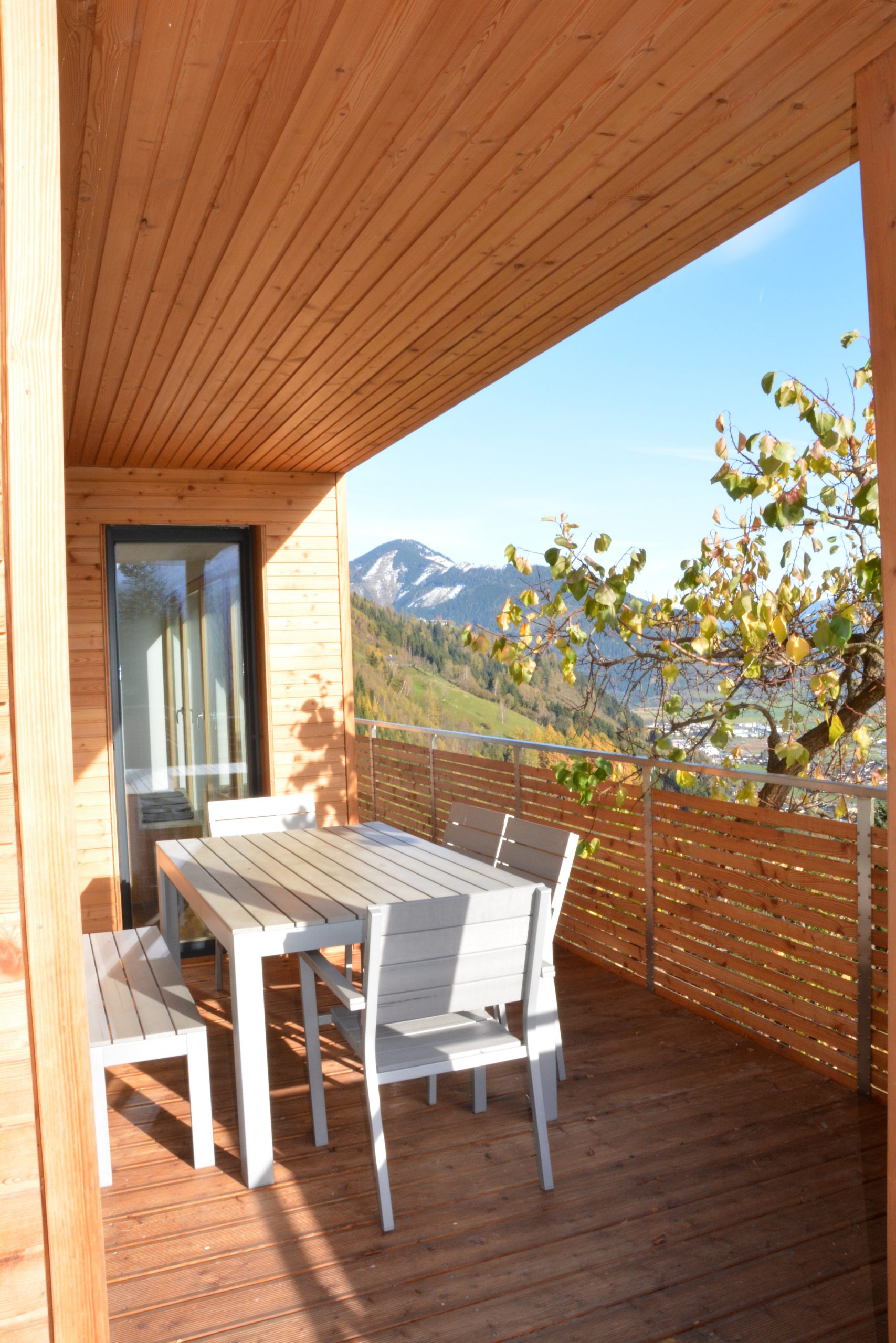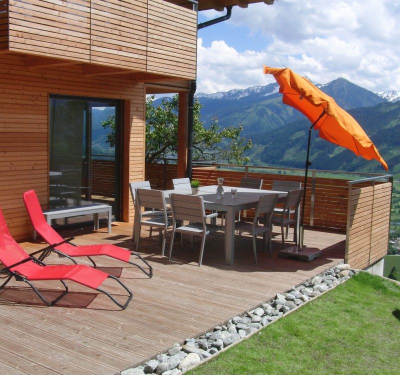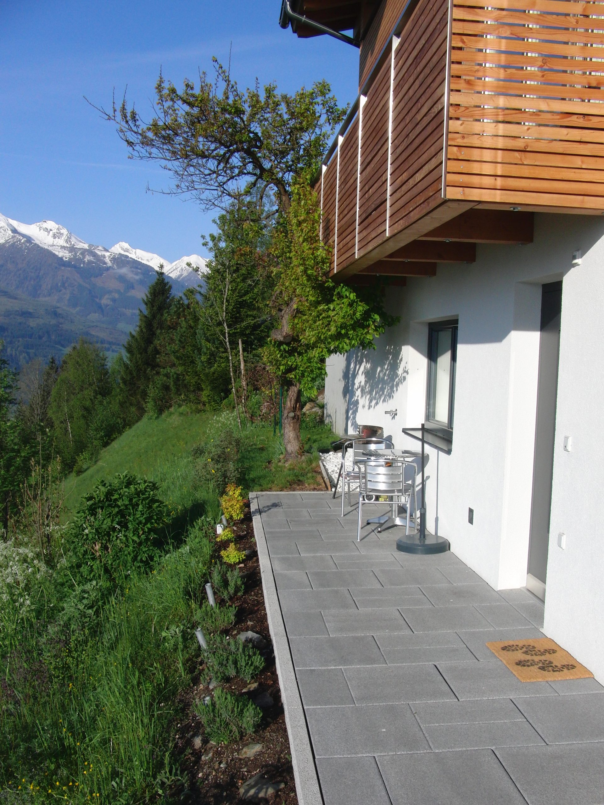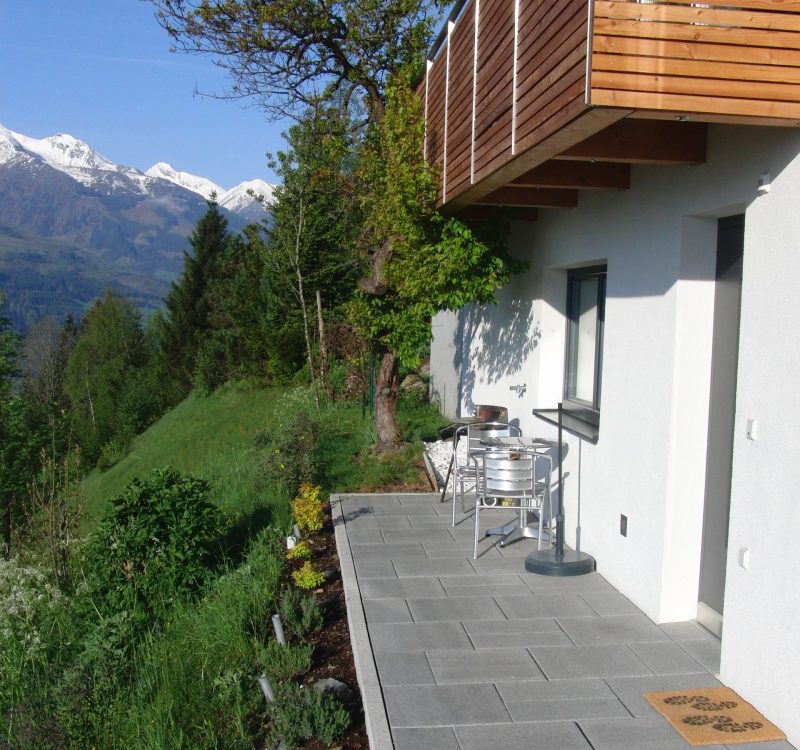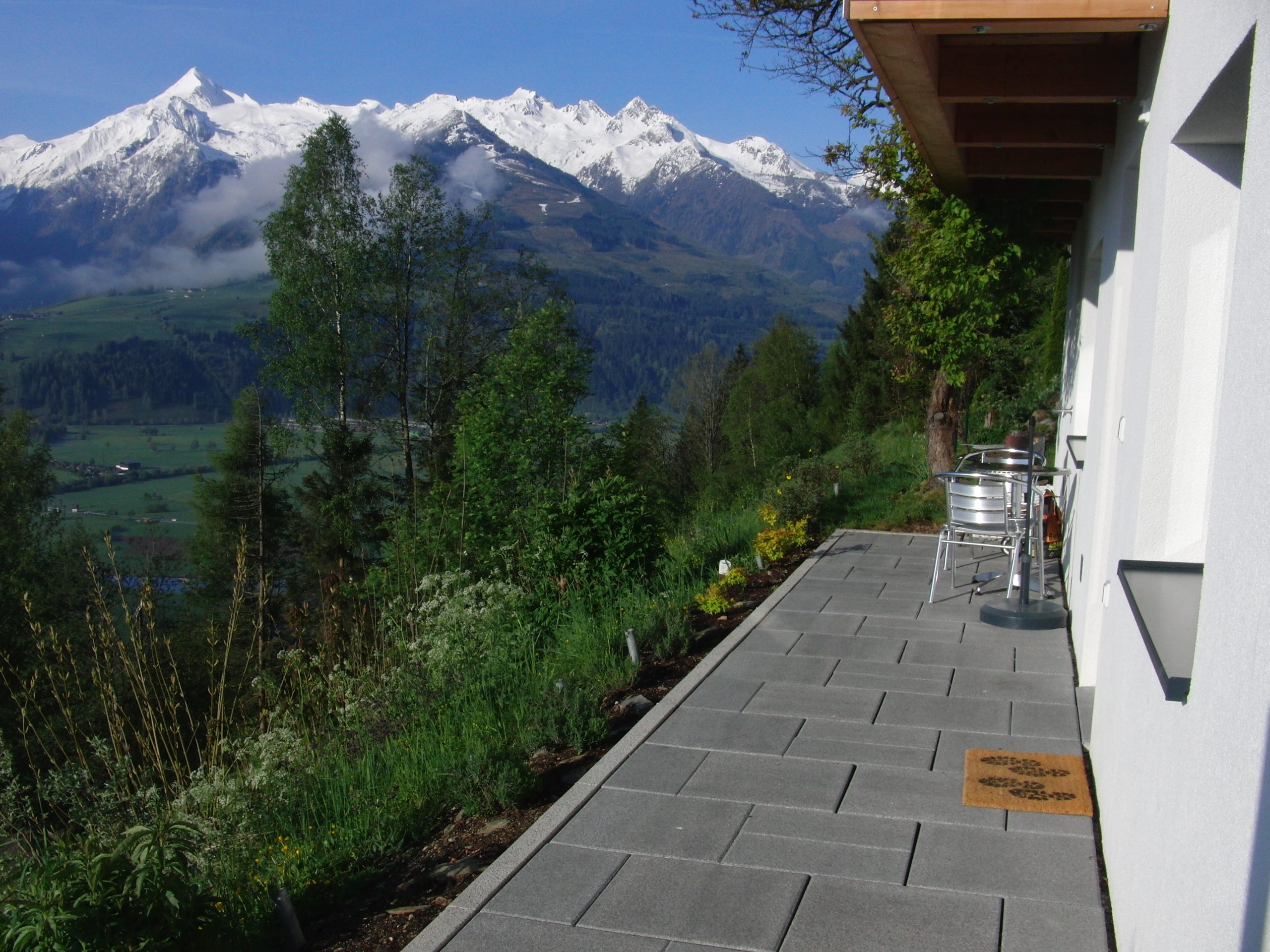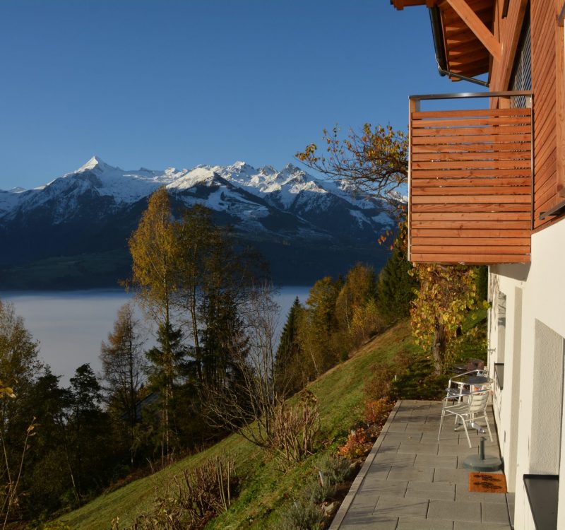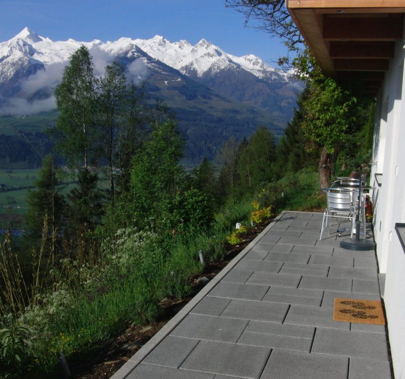 Besonders zu erwähnen ist die Südterrasse, die am Morgen schon in der Sonne liegt und so bei schönem Wetter zum Frühstück einlädt. Auch am Abend ist der Blick auf das Lichtermeer von Kaprun sehr beeindruckend. Da sie zum Teil unter dem Balkon der oberen Wohnung liegt, ist sie sehr lauschig und von der oberen Wohnung nicht einsehbar.
