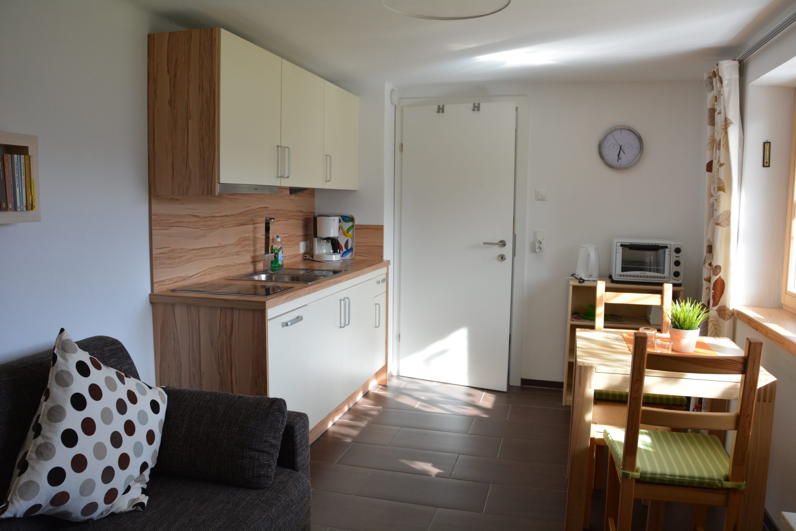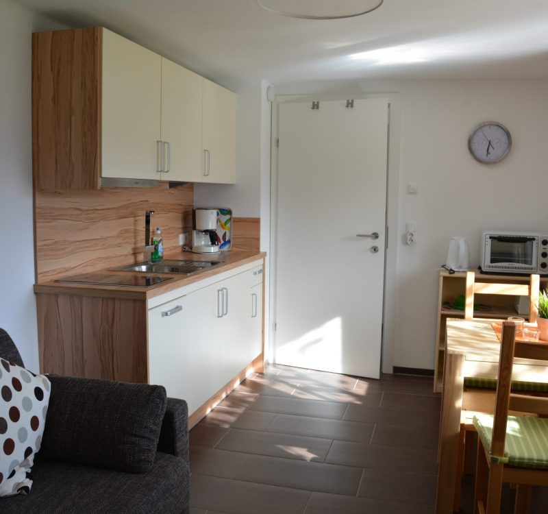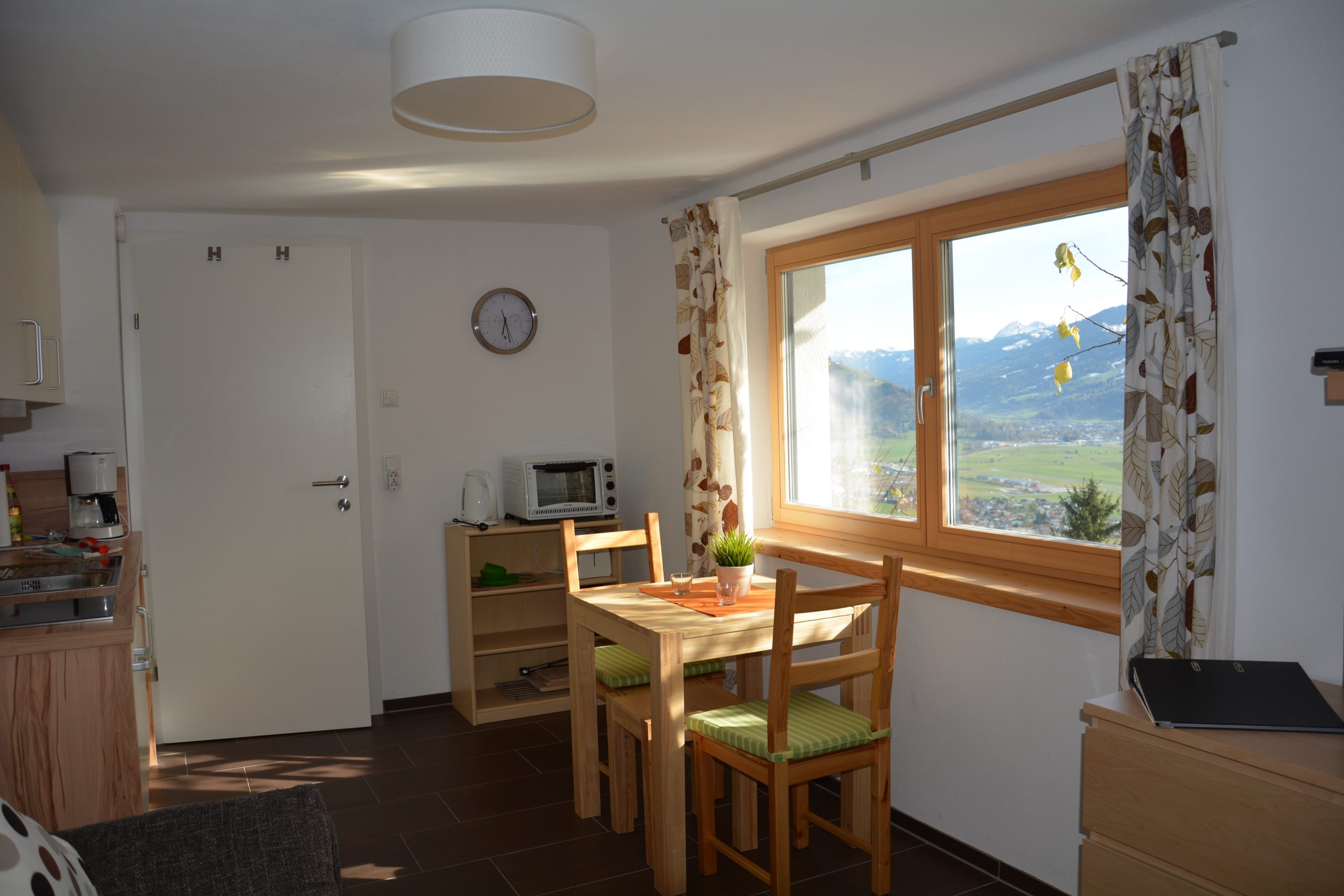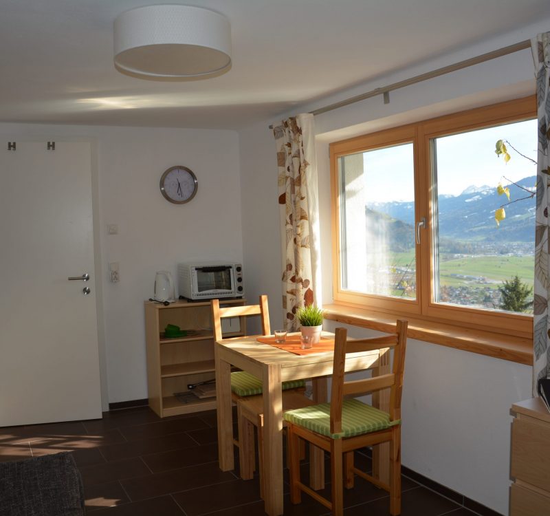 In dem gemütlichen Wohnraum steht der Esstisch direkt am Fenster. So kann man bei jeder Mahlzeit die fantastische Aussicht genießen. Dort ist auch die voll ausgestattete Küchenzeile. Sie verfügt über zwei Kochfelder, einen Kühlschrank sowie eine Spülmaschine. Ein Minibackofen, eine Kaffeemaschine und ein Wasserkocher sind auch verfügbar.