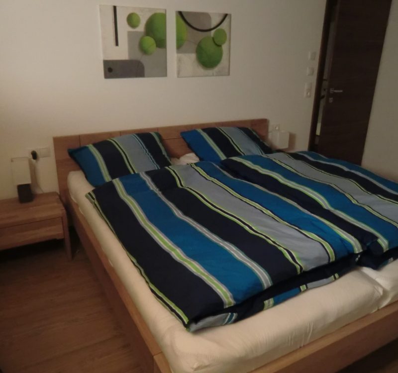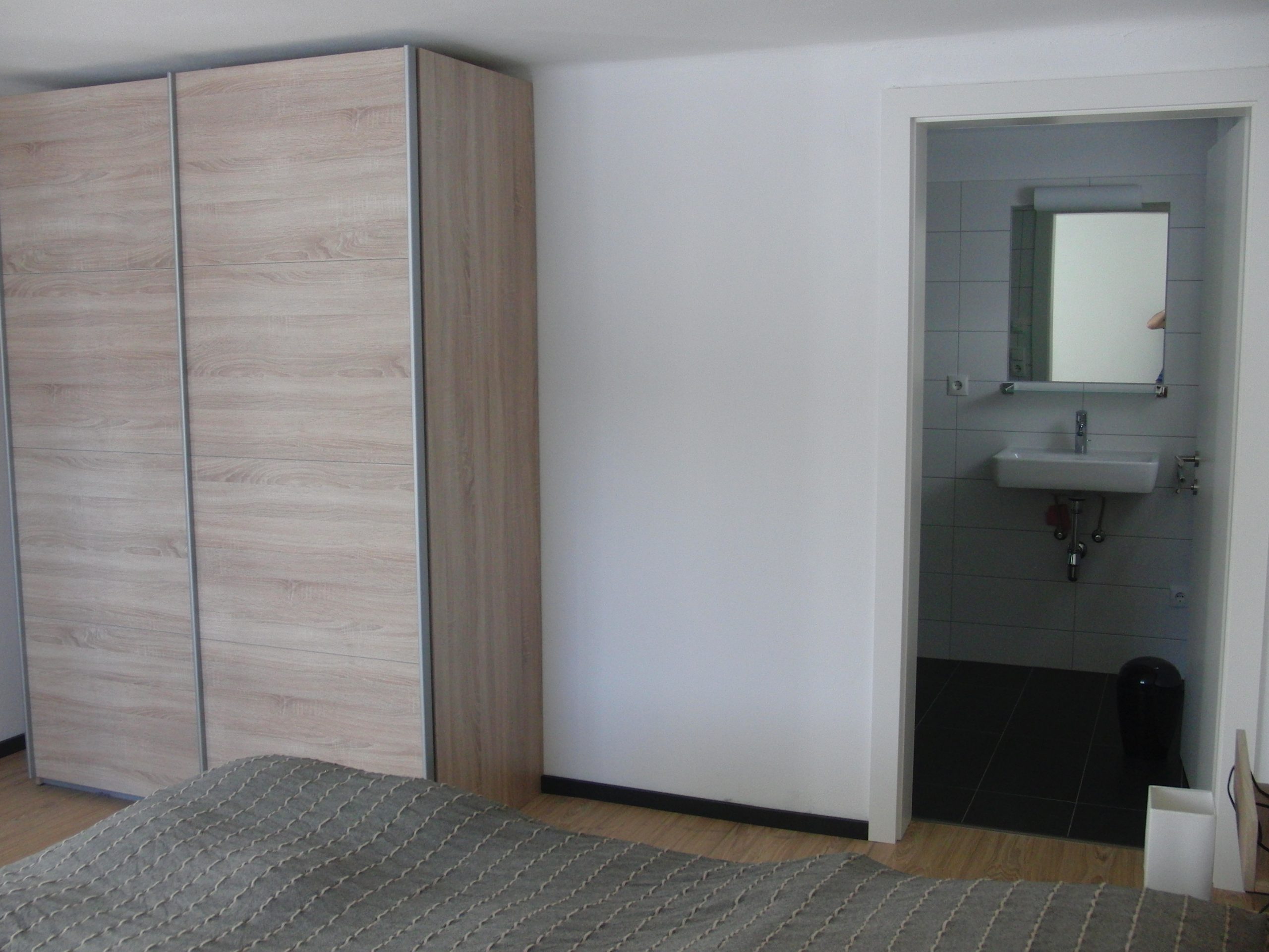 Vom Parkplatz gelangt man zu der unteren Wohnung über eine Außentreppe. Sie hat eine eigene Eingangstüre. In dem Doppelschlafzimmer sind ein großer Kleiderschrank und auch ein Schreibtisch vorhanden. Das Badezimmer verfügt über eine Dusche, ein WC und ein Waschbecken.