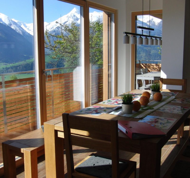 - Esstisch vor dem Fenster mit Aussicht auf Kaprun und den Golfplatz